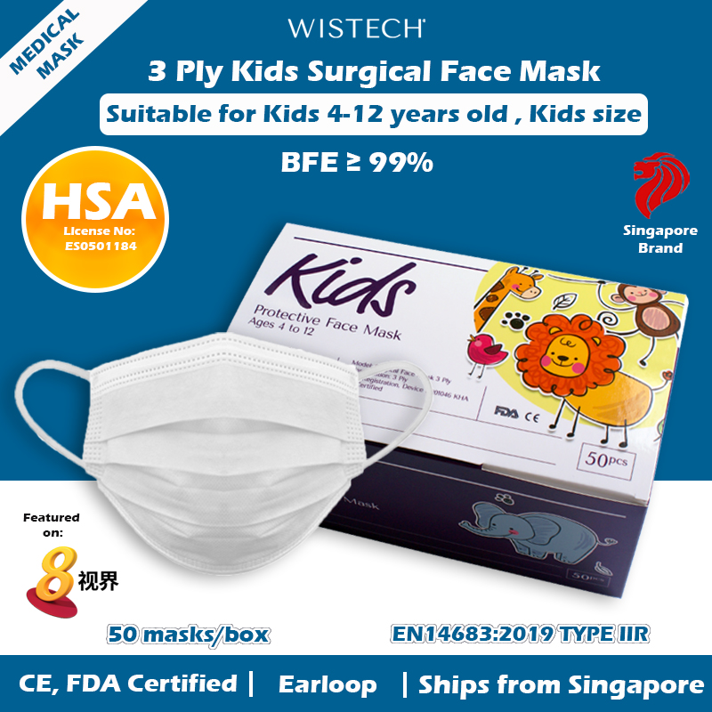 [OFFICIAL STORE] GET ADDITIONAL % OFF (Pink/others) Wistech 3 Ply Kids Surgical Mask, Protective Mask, Kids mask, Kids size, 4 to 12 years old, 50 pieces, HSA Notified Medical Device, FDA CE Approved,
