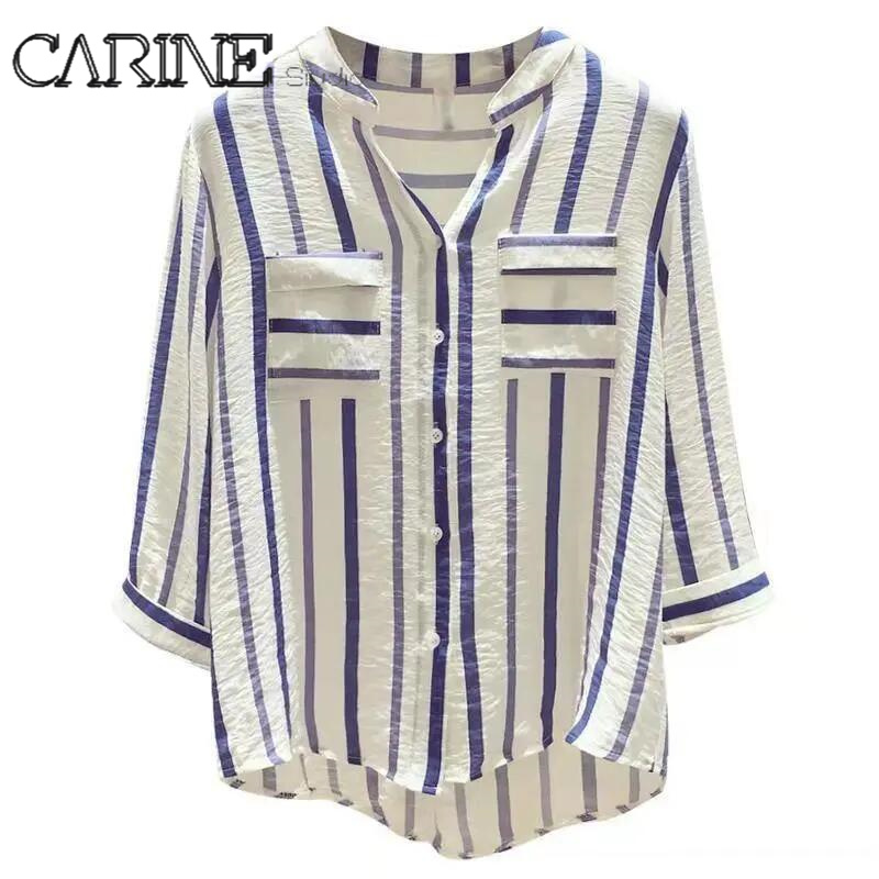 CARINE 2021 New Striped Korean Long sleeves Blouse Large size V collar Women Top