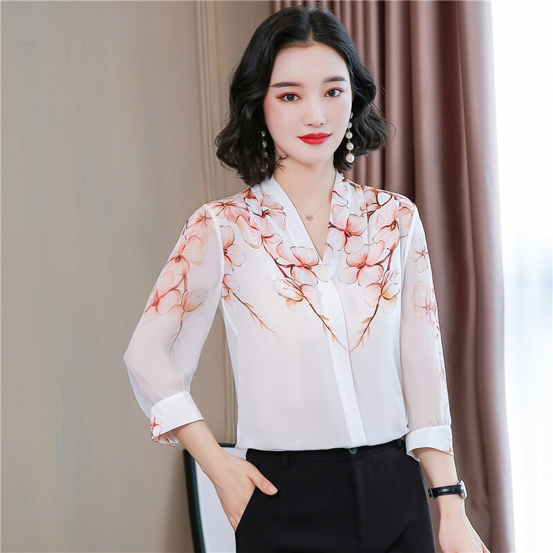 AFEG Korean style women's 3/4 sleeves V-neck printed temperament blouse for women