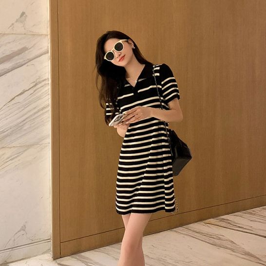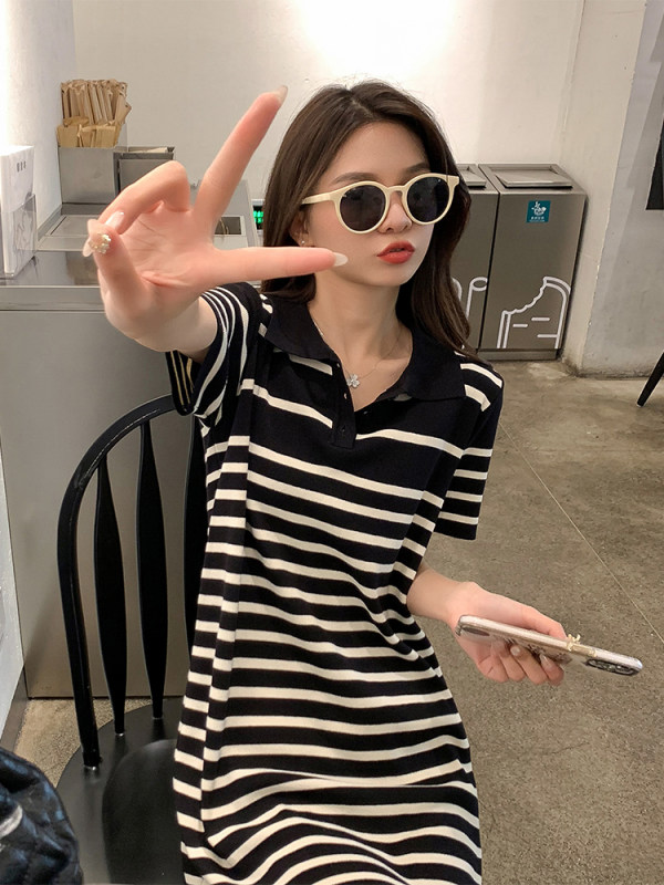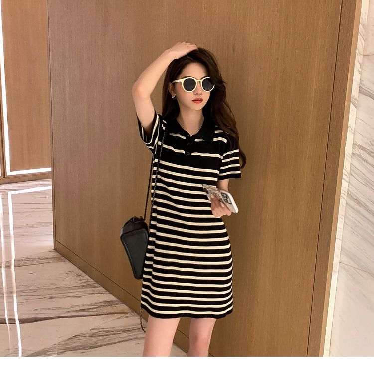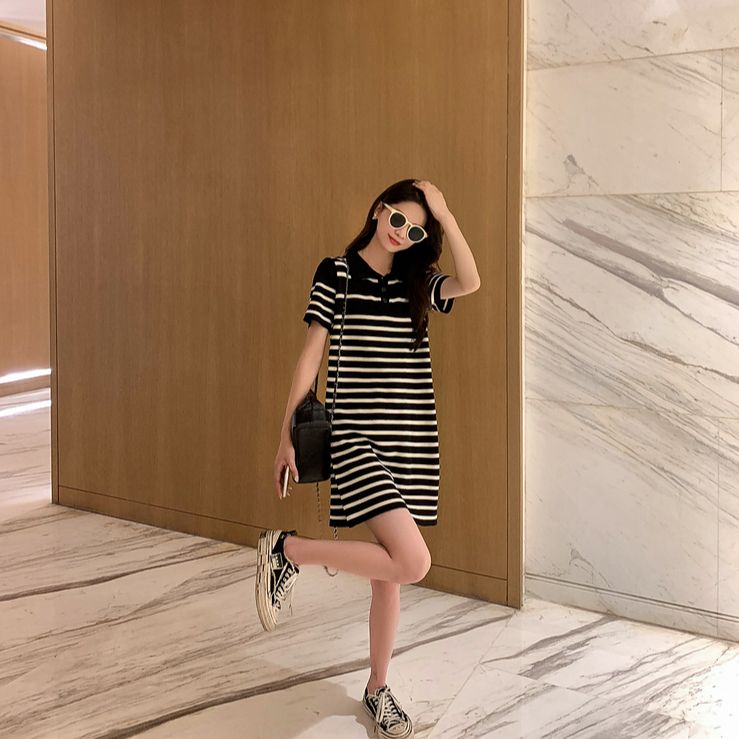 Missliu Fashion Korean Summer New Style Loose Casual Polo Collar Short-sleeved T-shirt Skirt Straight Fashion Striped Dress