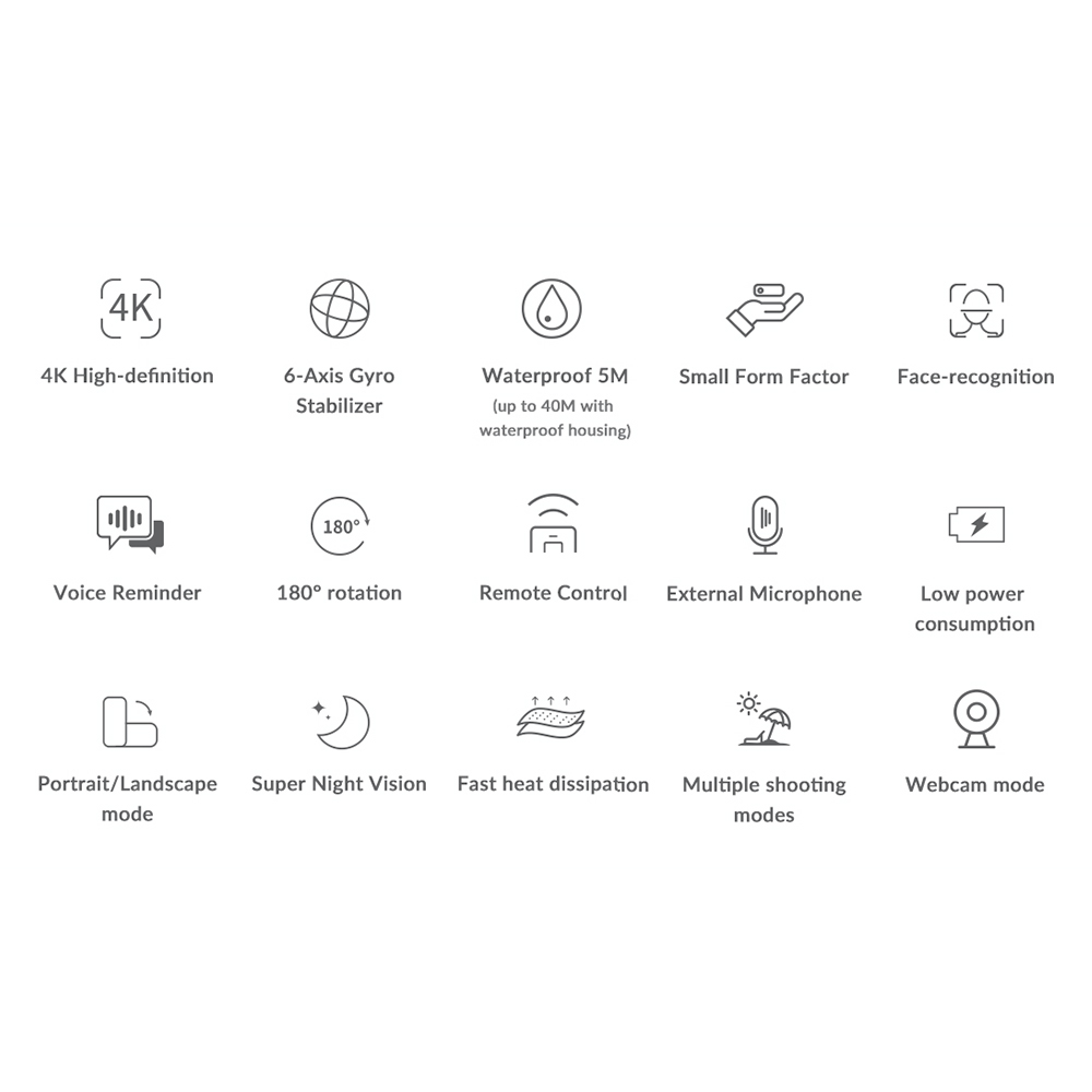• 4k resolution Action camera: Adopts high-resolution image sensor, supports 4K/24fps HD video recording; 6-axis anti-shake design ensures more stable and more smooth recording image, and night vision function allows you to record wonderful videos even at night.