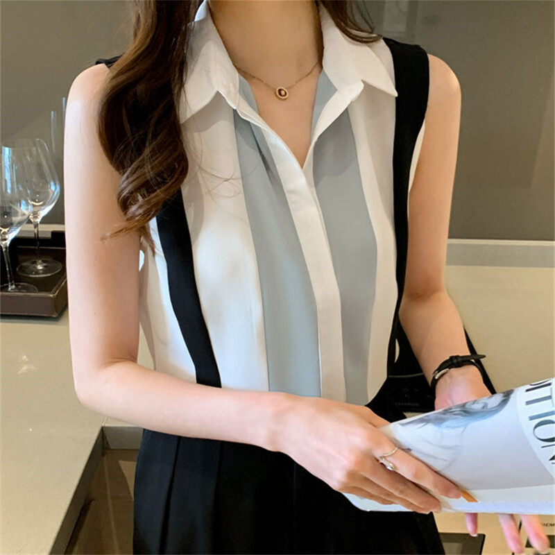 Sleeveless Shirt for Women Plus Size Chiffon Blouse Polo Collar Office Ladies Tops Summer Shirts