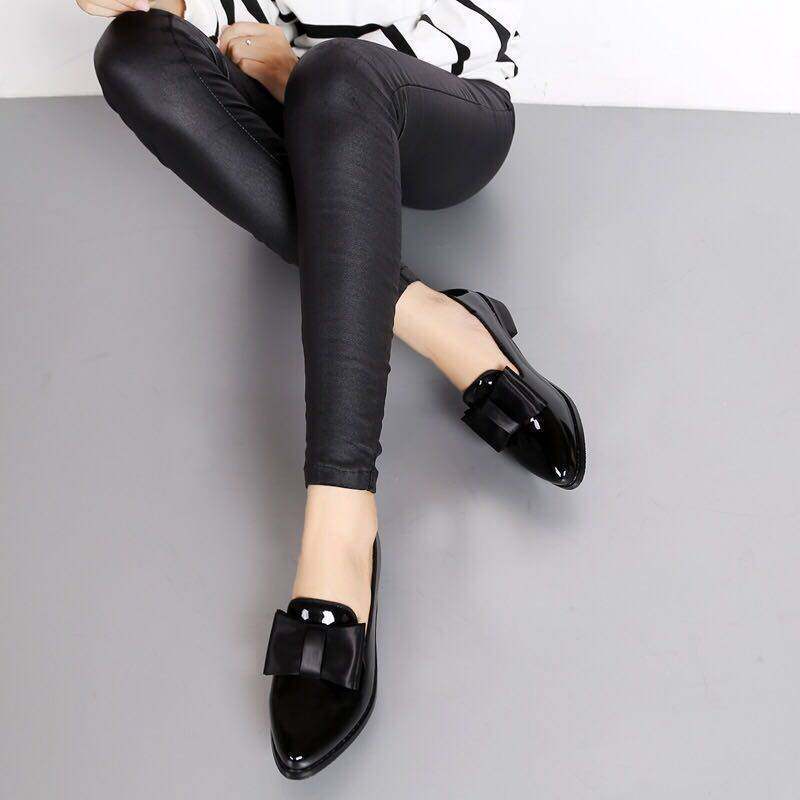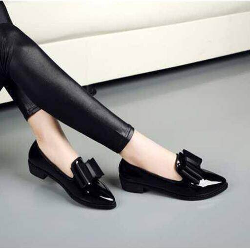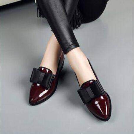 Ladies British Style Flat Pointed Patent Leather Bow Low Heel Small Leather Shoes