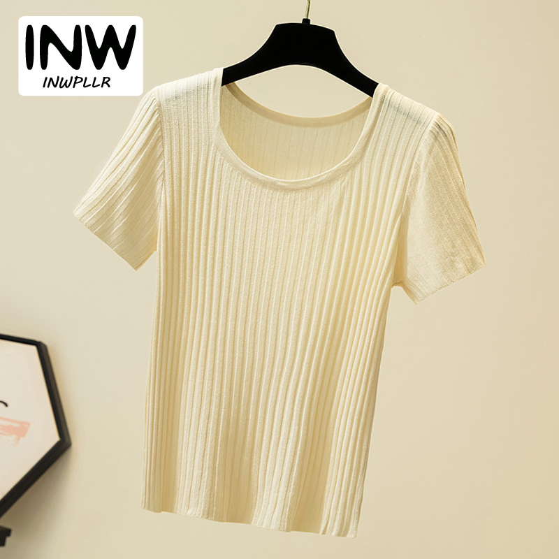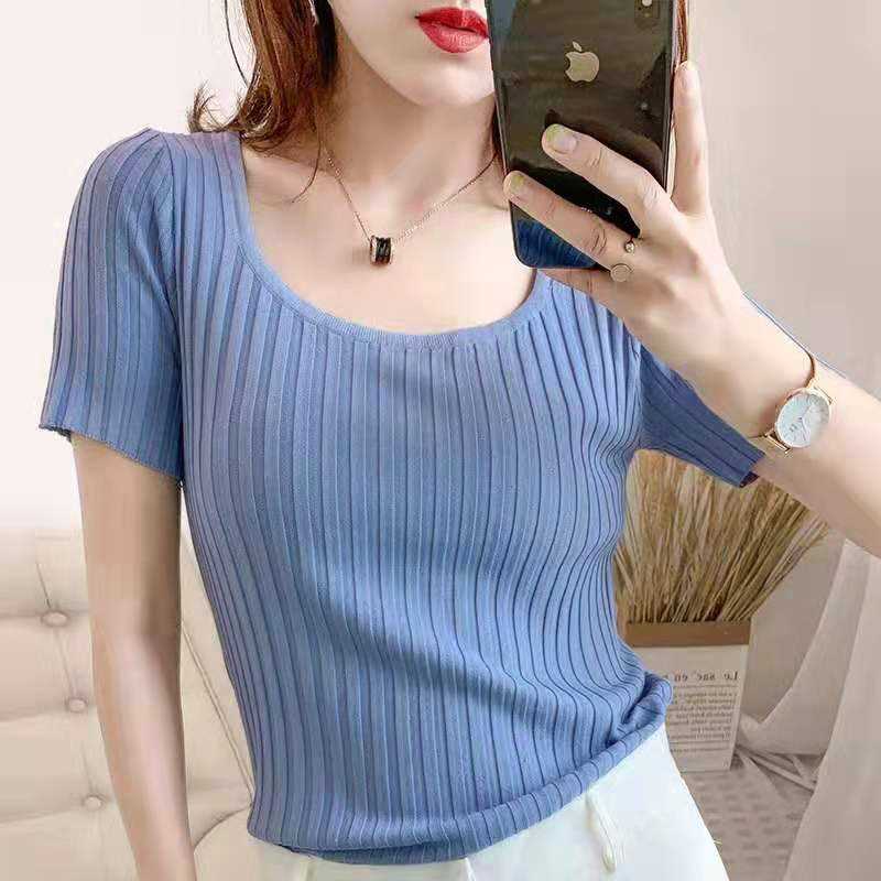 INWPLLR Ice Silk Knitted T-shirts Women Short Sleeved Square-neck Tops Summer All-match Simple Solid Tshirt Ladies