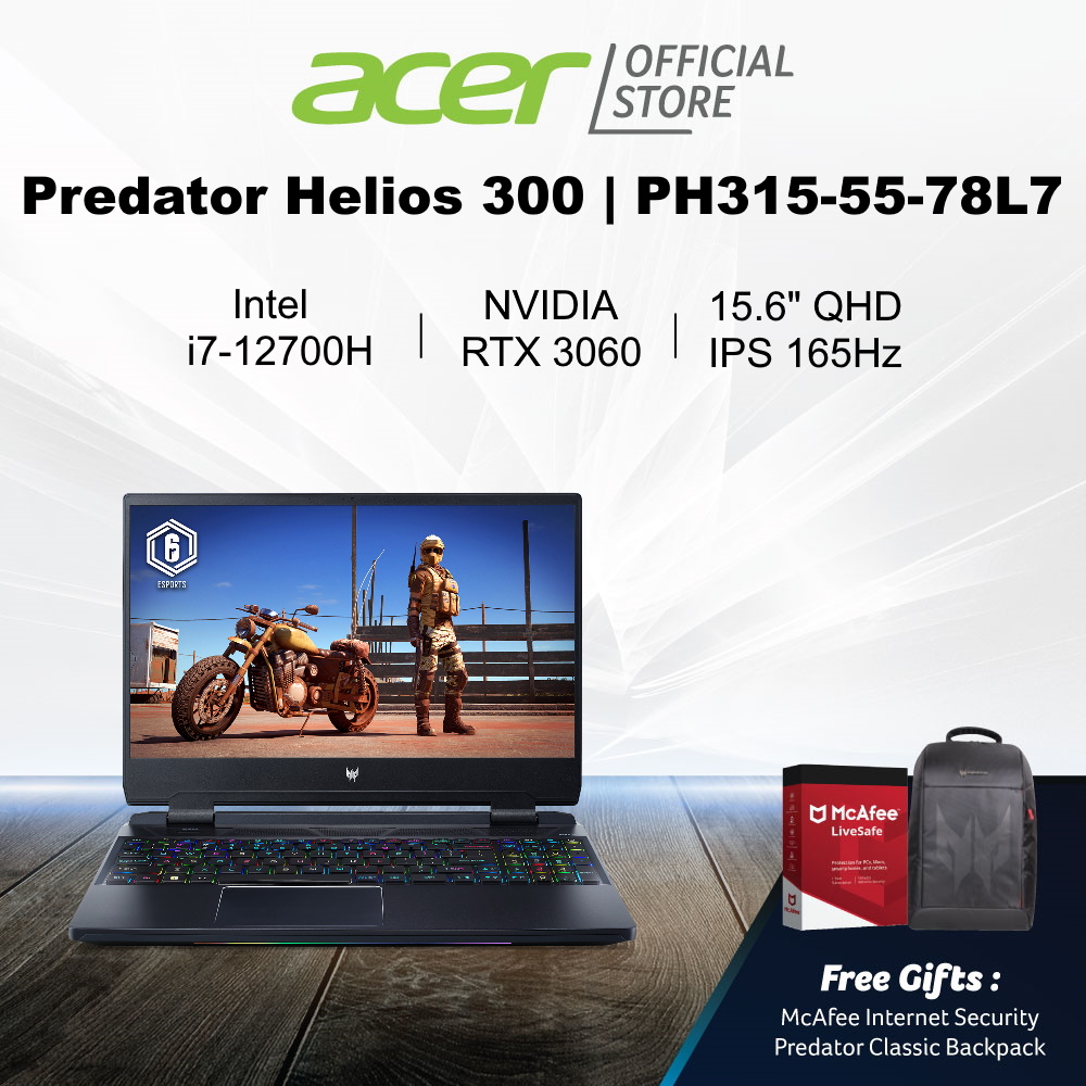 [NVIDIA RTX 3060 And Intel 12th Gen i7-12700H] Predator Helios 300 PH315-55-78L7 15.6" QHD IPS 165Hz Gaming Laptop