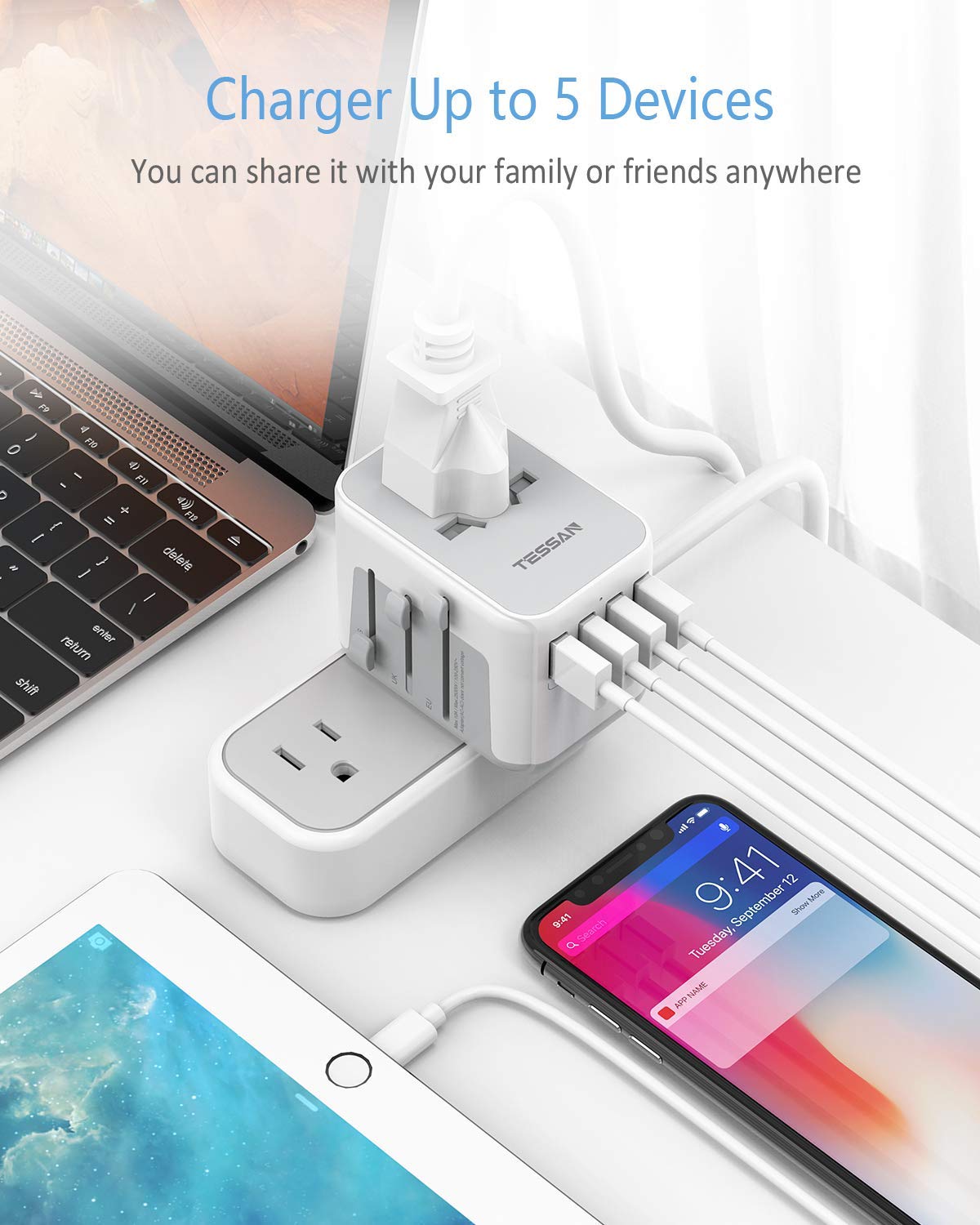 International Travel Adapter with 4 USB Outlets + 1 Universal Outlets, TESSAN Socket European Power Plug Adaptor Worldwide All in One Wall Charger Converter Travel Plug USB Charger Power Adaptor for