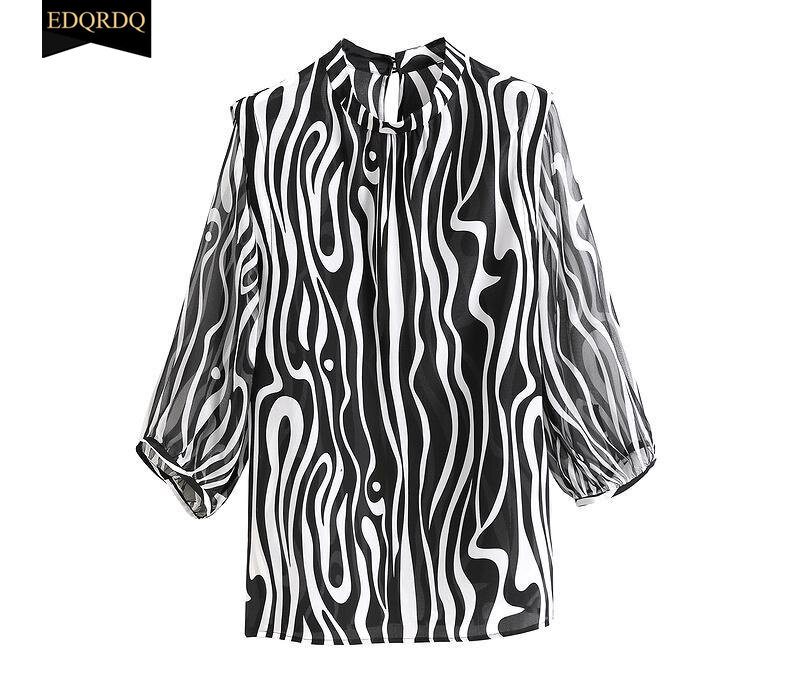 EDQRDQ Womens Round Neck Striped 3/4 Sleeve Elegant Chiffon Blouses Top