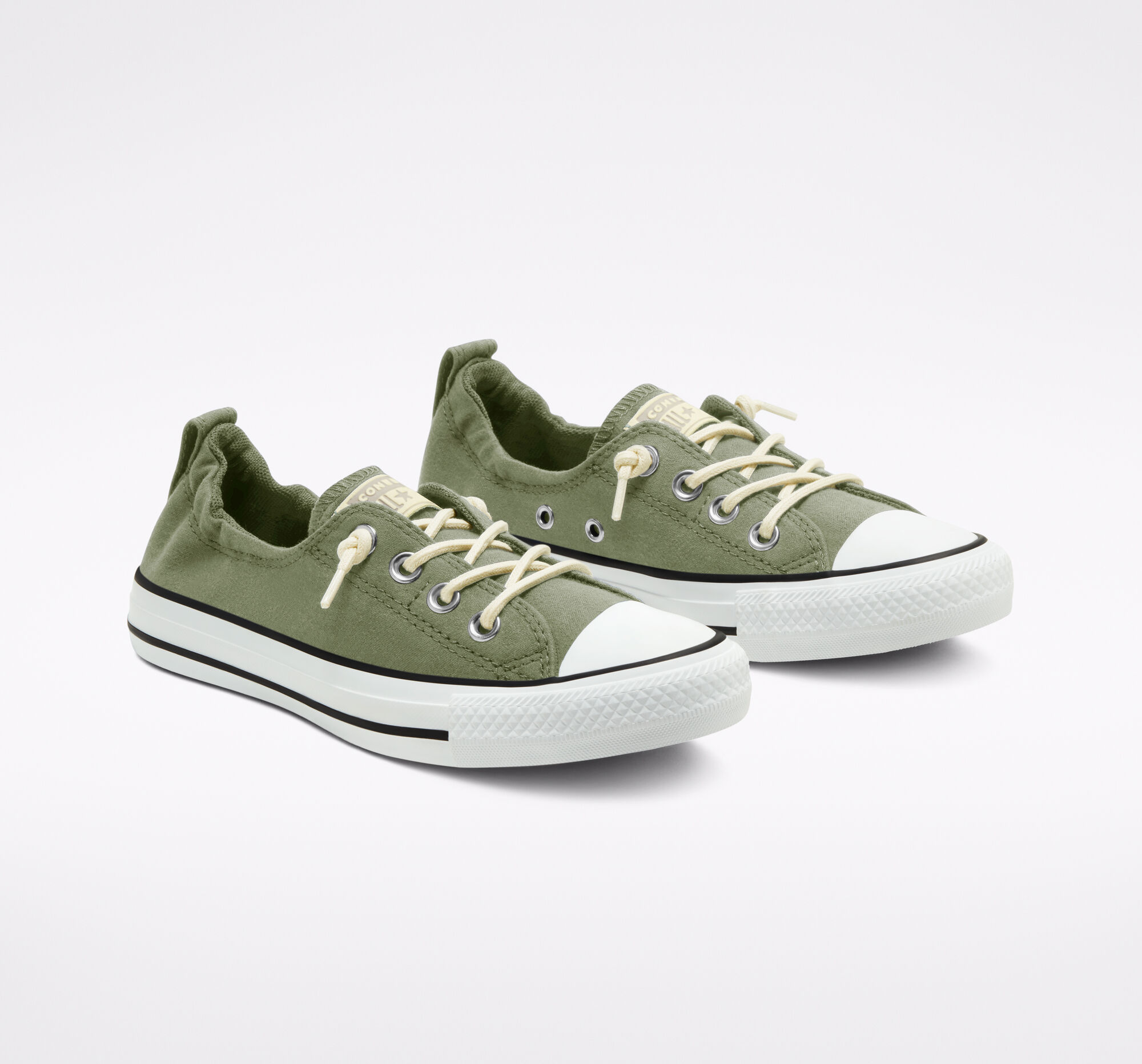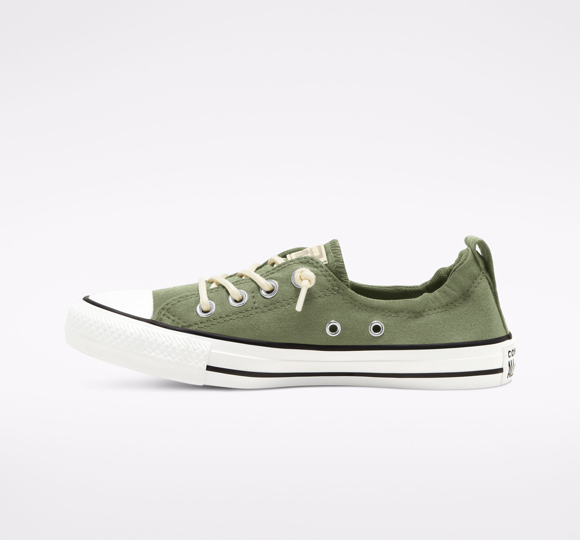 CAREFREE.The laidback design, reinvented. The Shoreline Linen Low Top sneaker is a relaxed and reconstructed take on the Chuck Taylor shoe, with an elasticized collar and knotted laces. Pop-color stitching on the heel stay and tongue logo adds new dimension, while the linen upper brings on the breeze. Easy on. Easy off.