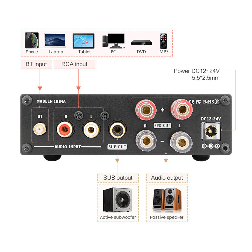 Amplifier * 1 Bluetooth antenna * 1 Audio Cable * 1 User's manual * 1 (Power Supply * 1 ) Depends on your selection