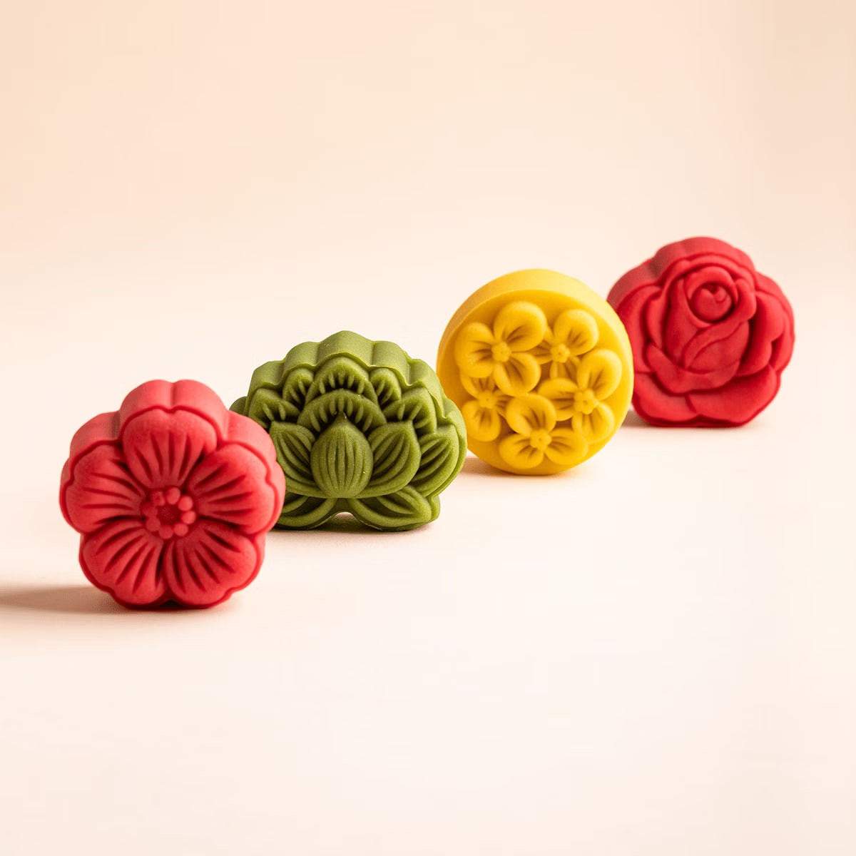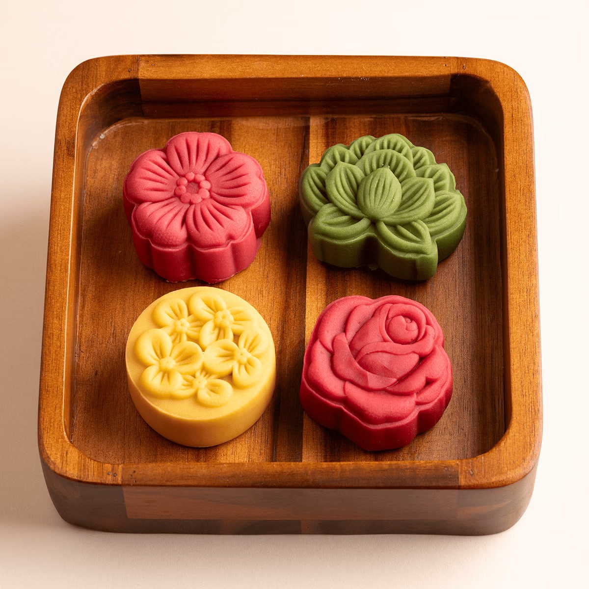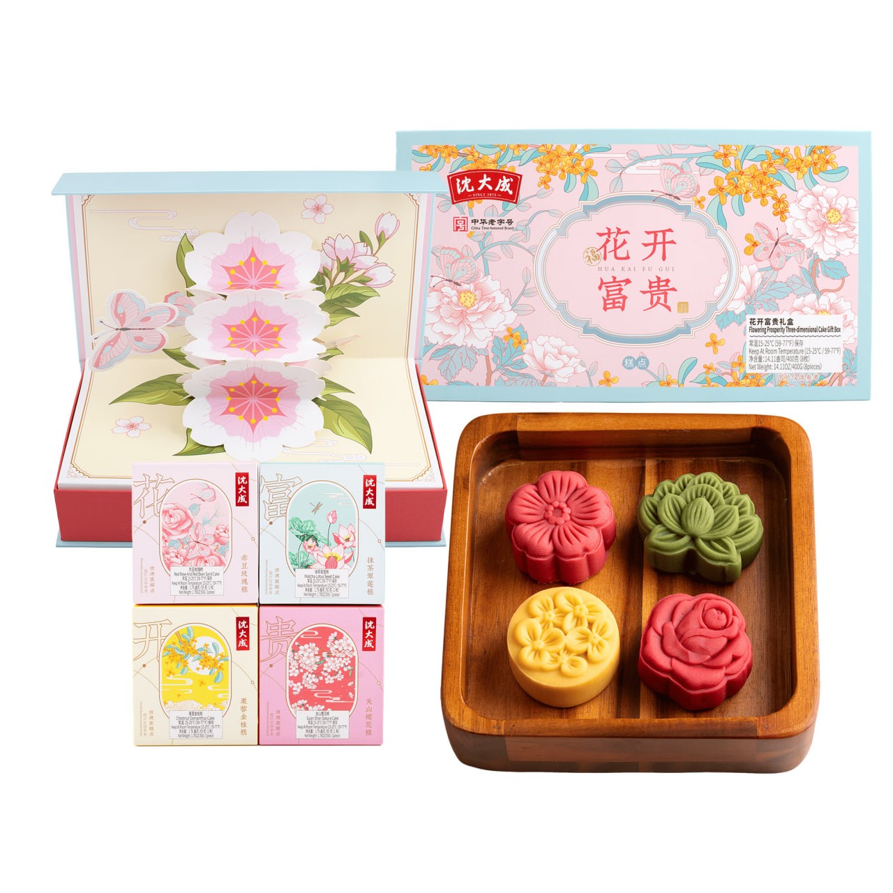 Matcha Green Lotus Cake*2; Chestnut Paste and Osmanthus Cake*2; Guanshan Cherry Blossom Cake*2; Red Bean Rose Cake*2